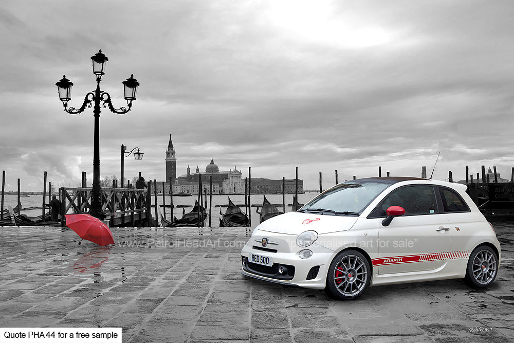 I created this classic looking piece of Abarth art using one of my Venice backdrops I took shortly after some rain which left some great puddles and moodiness enhanced in my black and white photo finish. This can also be personalised further with a more appropriate number plate. Photographed and enhanced by myself Rob Paston so I can personalise it further with number plates, arty options creating a truly unique piece. Any size, any material framed, canvas, metal, glass and giant fabric for garages.