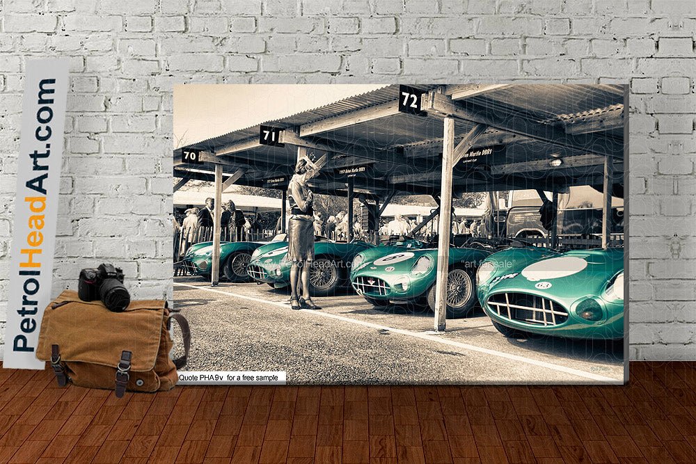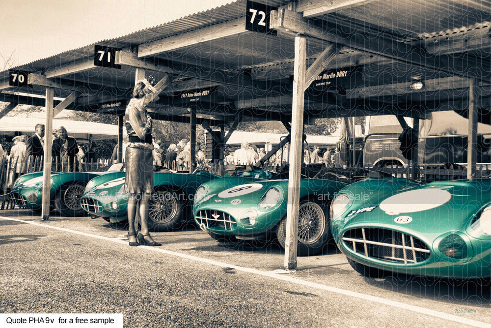 Another one of my Favourite moments, capturing this probably never to be recreated Aston Martin DBR1 Art line up. These marvellous machines were first made in 1956 and in 1959, one famously won the Le Mans 24 hour. As ever I waited patiently to catch the grace of the lady and the Astons, here finished in my warmer vintage option to my black and white and spot colour options.