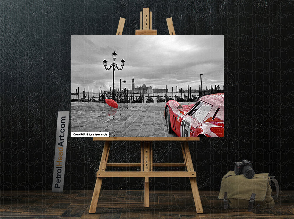 For me I was playing, trying to create something from this wet backdrop just needing a suitable car, naturally a Ferrari, complete with rain drops. Cue the coffee, late night perusing my back catalogue of Goodwood Revival shots and later that same day ( night), there you have it, a stylish Iconic Italian view and a big red iconic Ferrari in the rain, working well together who would of thought it, Ferrari Breadvan art in Venice., here for sale for your wall.