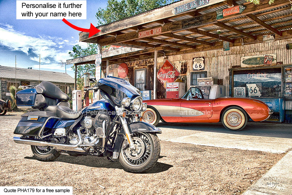 Two icons in one with my Harley art and the Corvette created from a backdrop on Route 66. A real time warp location with this 56 Corvette in the background along with plenty of iconic 60’s style memorabilia. Personalise it further with your own metal signage or in any of my other paint or photo effects to finish this piece of Harley Corvette art.