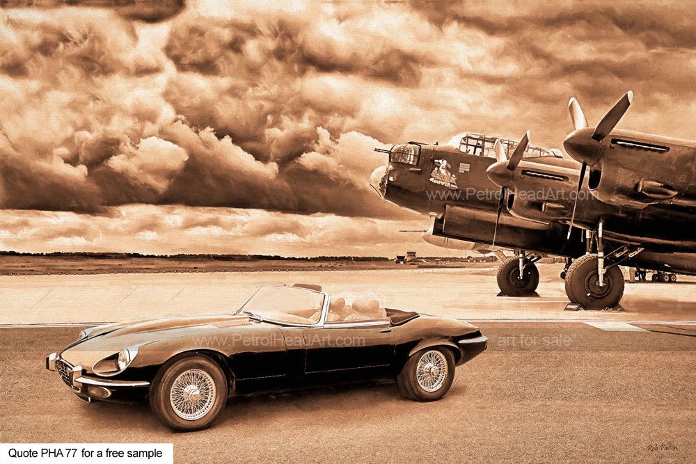 Two great British Icons here with my Jaguar etype and Lancaster art. Both positioned in there prime, and in fine detail from the wire wheels in the E Type to the detail in the Lancaster cockpit. Finished in a rich warm tinted paint effect enhanced by this moody sky and if you look carefully, you might just see a bit of a Vulcan.