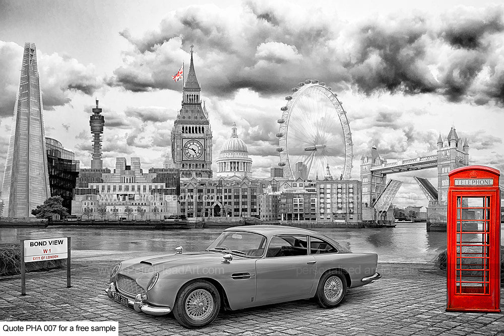 I wanted to create an ultimate London backdrop, being a big James bond fan this soon grew into a more James Bond DB5 art. Showing this iconic Aston Martin DB5 as actually used in a previous Bond film set against MI5 along with a few more of London’s fine landmarks all over shadowed in an appropriately moody sky. This James bond DB5 art which I call it Bond, Bond View, can be personalise however you like to suite your home or office and does have a bit of an edge Framed in one of my black and silver frames. This DB5 will be returning in several other designs.