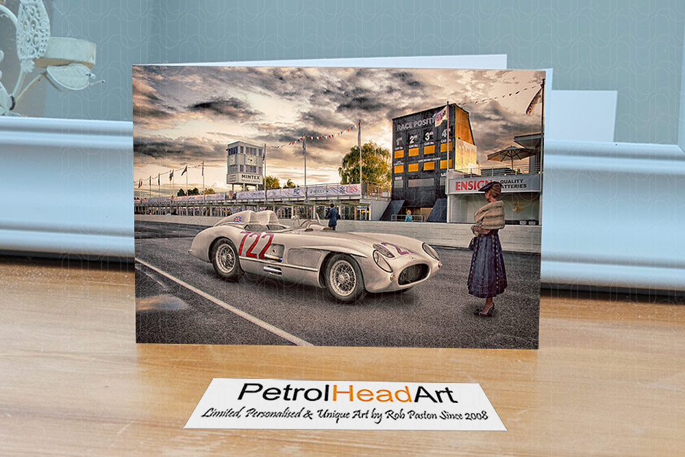 This Mercedes 722 Greetings Card is a high quality image card with envelope from my personal gallery of art over the years. Quite possibly the most expensive Mercedes in the world, in one of the most iconic Historic race weekends in the world Goodwood Revival.