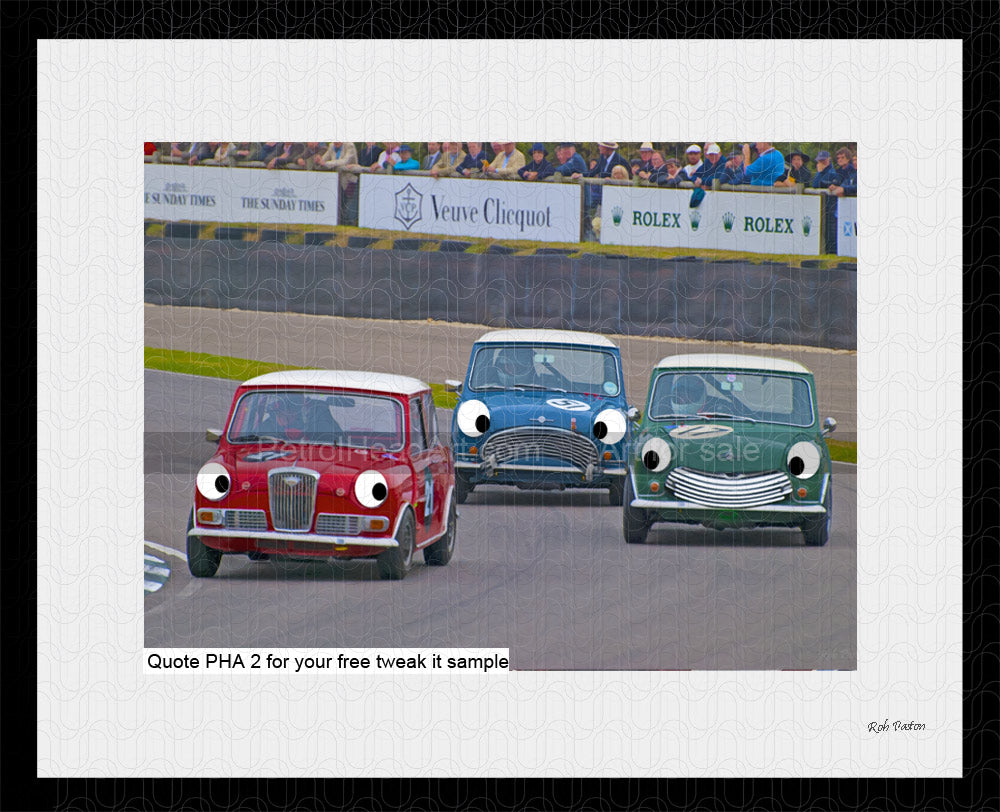I captured these 3 Mini’s were racing at Goodwood where the crowd was having has as much fun as the drivers Just saying. Designed very late at night possibly under the influence of something other than coffee. This Mini racing art piece could work well in a paint effect as well as this vibrant photo effect.