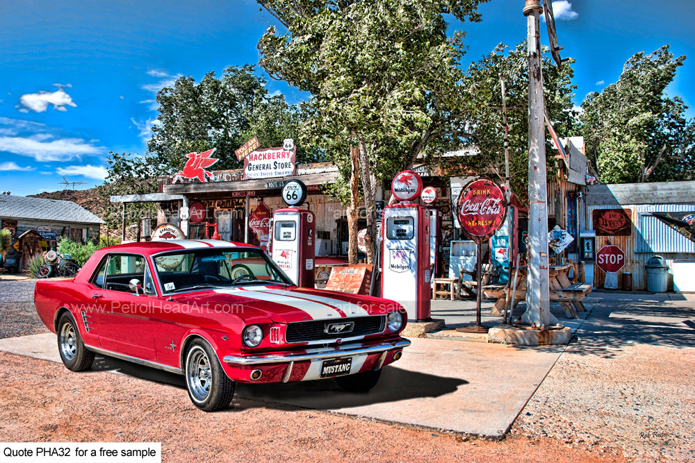 This piece of 1966 Mustang art in one of my Gas Station really sets off 1960’s iconic Route 66 America. The vibrant colours in this light paint effect will brighten any wall, taking you back to a 1960’s time warp, the numerous iconic signs and gas pumps will occupy you for ages, you may even be able to spot the outside loo. If that’s not enough for you, personalise it further with your name instead of Hackberry and of course in any of my photo or paint effects.