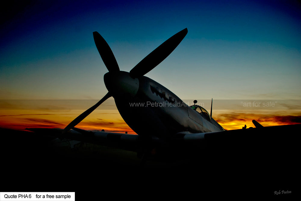 This piece of spitfire art shows this iconic front end silhouette against a wonderfully clear evening sky with a slight reminder of a sunset illuminating the cockpit and fuselage. Perhaps a poignant moment to those who flew more than an iconic piece of Spitfire art for your wall. Perfect in colour in this photo or paint finish and with thanks to those who flew and still fly these Icons of the sky.