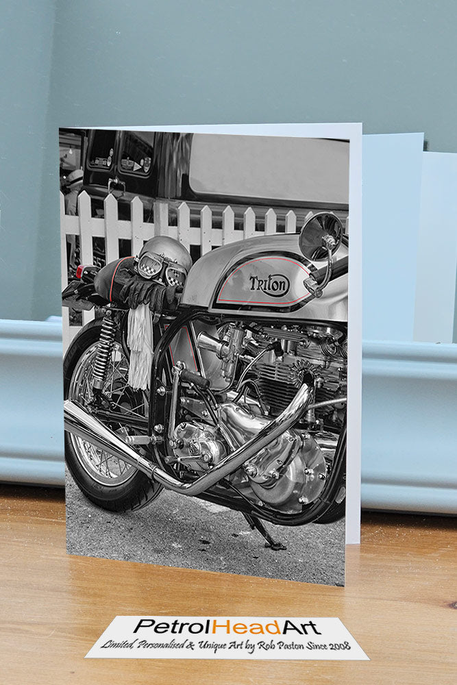 This Triumph Triton Art For Sale Greetings Card is a high quality image card with envelope from my personal gallery of art over the years, great for birthdays or for sending event tickets these cards are left blank for your special message.